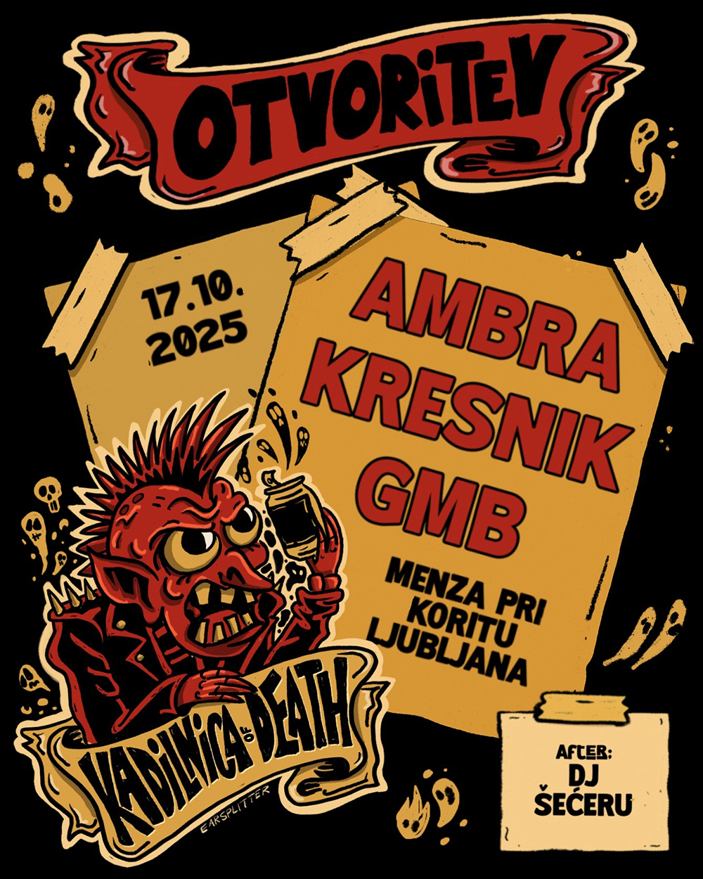 17.10.2025 - Kadilnica of Death Opening: Ambra (Slo), Kresnik (Slo), GMP (Slo) @ Menza pri koritu, Metelkova, Ljubljana | 21.10.2025 - Testament (USA), Obituary (USA), Destruction (Ger), Nervosa (Bra) @ Media Center, Ljubljana | 29.10.2025 - W.A.S.P. (USA) @ Media Center, Ljubljana | 31.10.2025 - Halloween: 80s Goes 90s Halloween Party @ Menza pri koritu, Metelkova, Ljubljana | 01.11.2025 - Afsky (Dk), Myrdal (Ger) @ Menza pri koritu, Metelkova, Ljubljana | 05.11.2025 - As I Lay Dying (USA) @ Cvetličarna, Ljubljana | 08.11.2025 - Kamra (Slo), Malorshiga (Slo) @ Kavarna Cukrarna, Ljubljana | 20.11.2025 - Gutalax (Cze), Spasm (Cze), Guineapig (Ita) @ Orto Bar, Ljubljana | 02.12.2025 - Perturbator (Fra), Kælan Mikla (Ice), Gost (USA) @ Kino Šiška, Ljubljana | 03.12.2025 - Battle Beast (Fin), Dominum (Ger), Majestica (Swe) @ Cvetličarna, Ljubljana | 07.12.2025 - Sinister (Nld), Pessimist (USA), Graceless (Nld) @ Menza pri koritu, Metelkova, Ljubljana